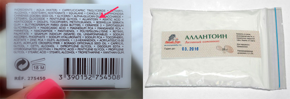 Его добавляют в детские кремы для устранения опрелостей, для быстрого успокоения кожи. Аллантоин используют в косметических антивозрастных средствах, которые повышают тонус кожи, разглаживают мелкие морщинки, снимают стянутость, устраняют растяжки после сильного похудения.