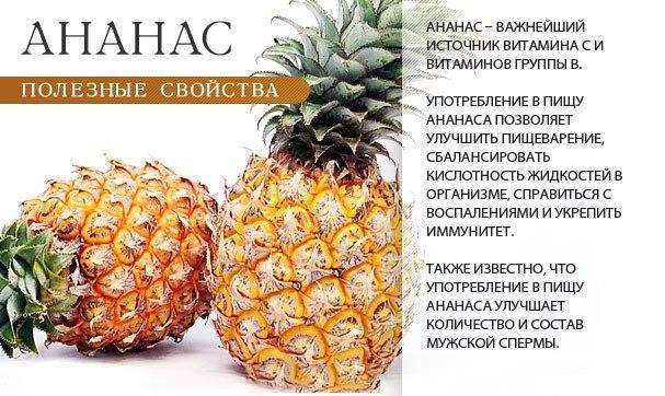 Экзотический фрукт считается природным катализатором расщепления жиров и содержит ценный растительный фермент – бромелаин, помогающий за короткий срок переварить пищу и снять отеки мягких тканей. Ананас обладает способностью сохранять полезные вещества продолжительное время. При регулярном употреблении продукт благоприятно воздействует на организм: