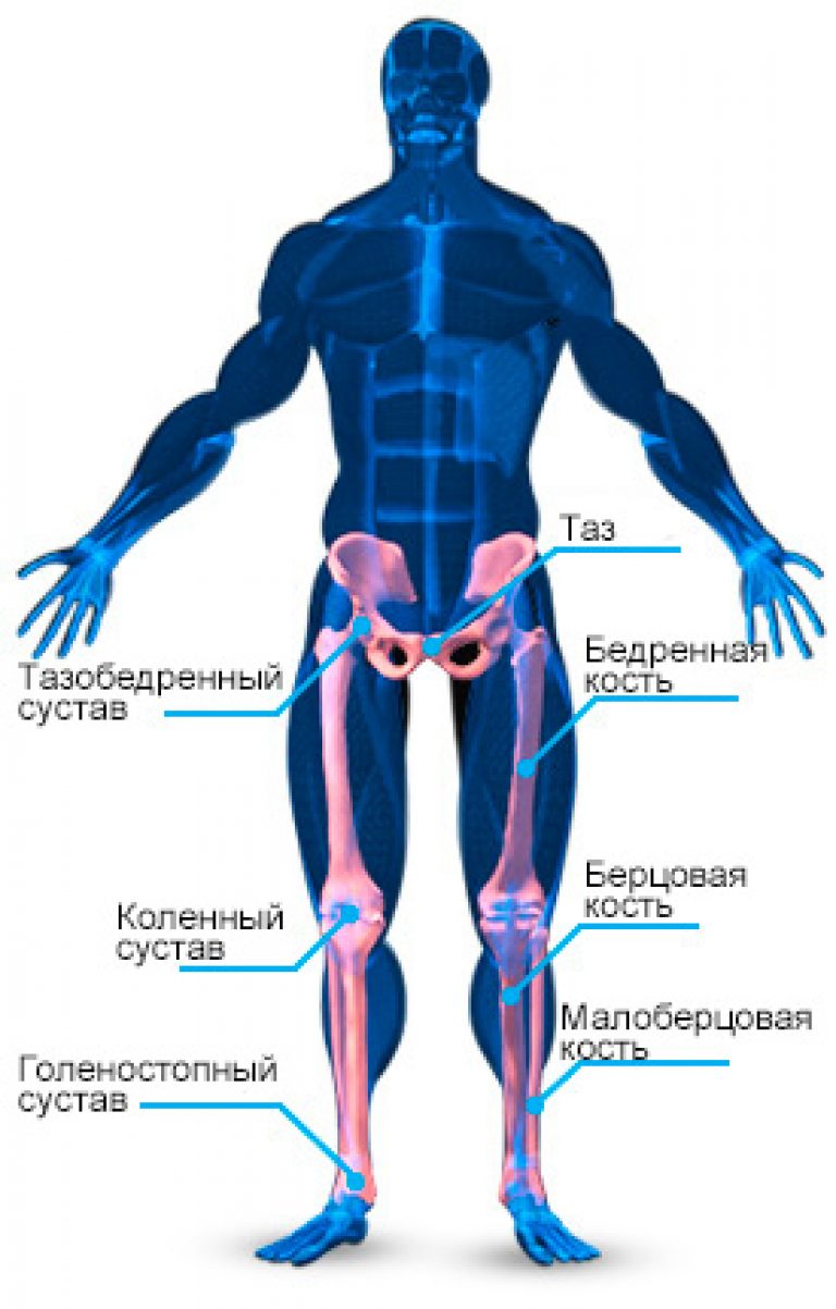 При взгляде на схему из чего состоит нога человека, видны три крупных сустава: тазобедренный, коленный и голеностопный. Тазобедренный сустав соединяет нижнюю конечность и туловище. Он образован бедренной костью и тазом. Имеет большую амплитуду движения, что позволяет людям свободно перемещаться, бегать и совершать другие движения.