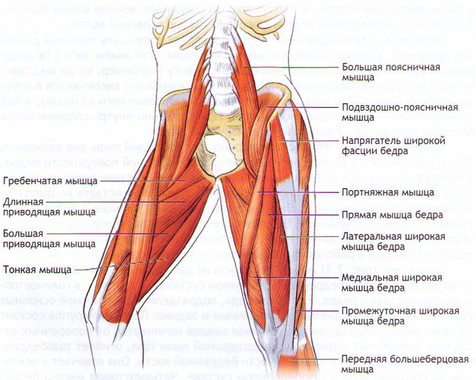 Мышцы нижних конечностей представлены важным отделом – элементами бедра. Эта категория является наиболее обширной, в ее основе лежит несколько групп мускулов. К их числу относят: