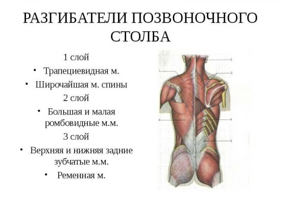 | 2 или средний | Малая и большая ромбовидные. | Разгибатели спины (Крестцово-остистая), включает подвздошно-остистую и длинную пучки; Поперчено-остистая (включает вращатели, полуостистую, многораздельные). |