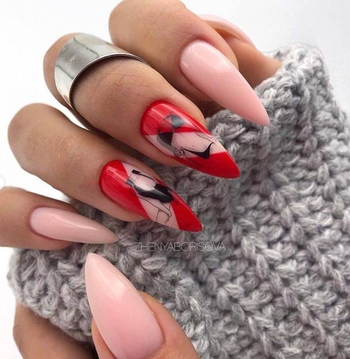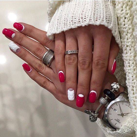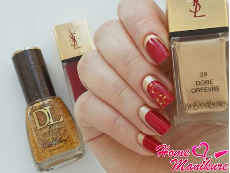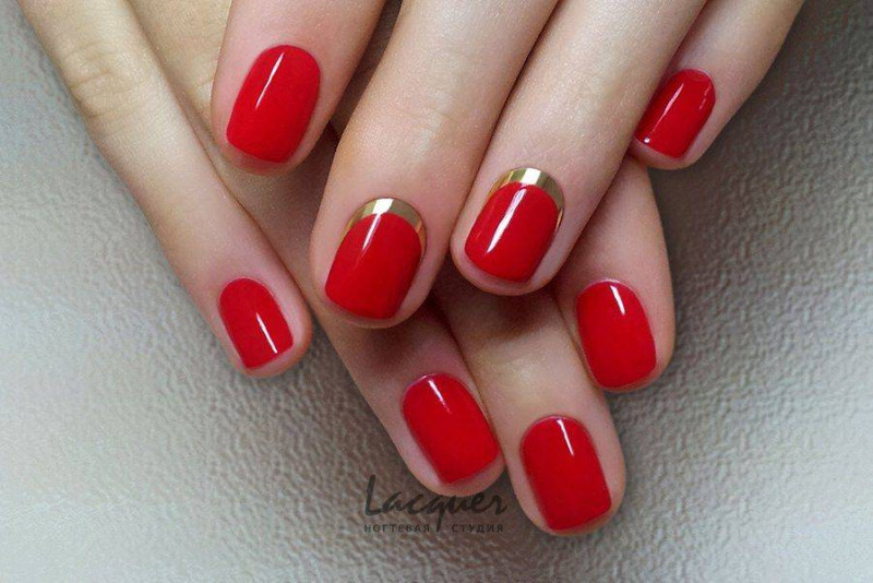 Возьмите в качестве первого покрытия белый лак, а следом нанесите красный, не закрашивая всей поверхности ногтя. Такой вариант дизайна будет смотреться одновременно строго, ярко и очень красиво. Вы можете поменять местами цвета, поскольку эти два оттенка одинаково прекрасно будут смотреться в любом исполнении. Неплохо сочетаются между собой золотые и красные лаки, с помощью которых можно создать роскошный вечерний нейл-арт. Как этого добиться, вы узнаете, просматривая подборку великолепных фото.