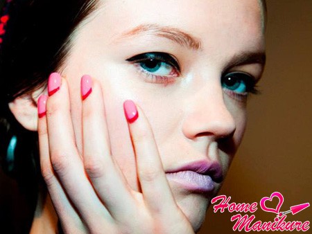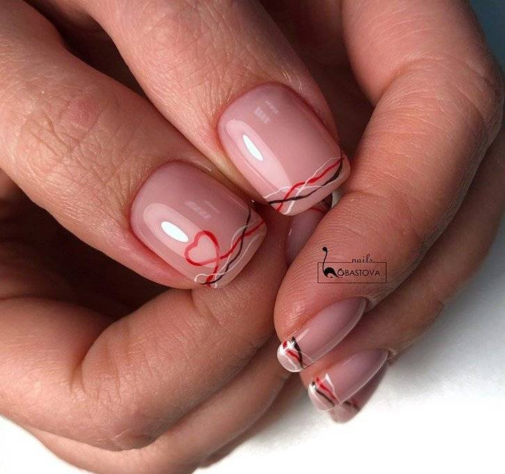 Линию улыбки рисуют однослойным путем, то есть после нанесения основного слоя (фона маникюра) рисуют другим цветом тонкую линию у кутикулы, продлевая ее в направлении к боковым валикам ногтя. Таким приемом можно визуально скорректировать форму ноготка, особенно, если она кругловатая или лопатообразная.