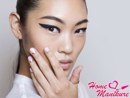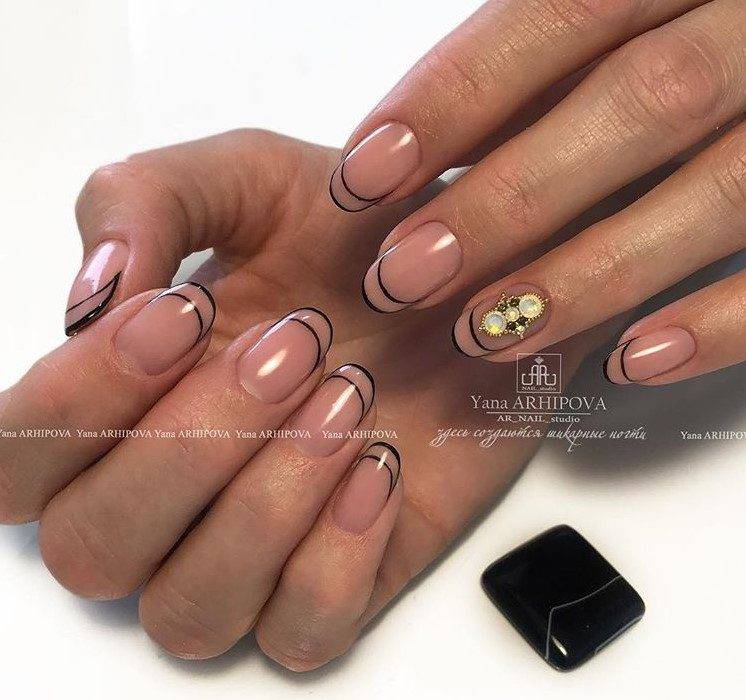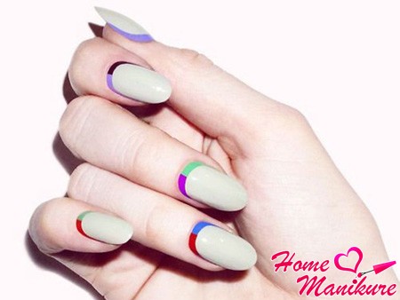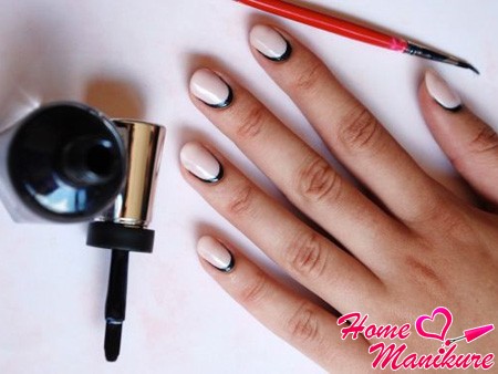Один является основой, вторым рисуют дужку. Он примечателен тем, что за счёт дужки визуально удлиняет ногтевую пластину. При такой особенности ногти кажутся более изящными, что очень актуально для уплощённой природной формы.