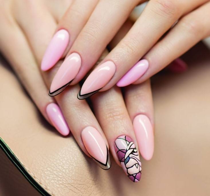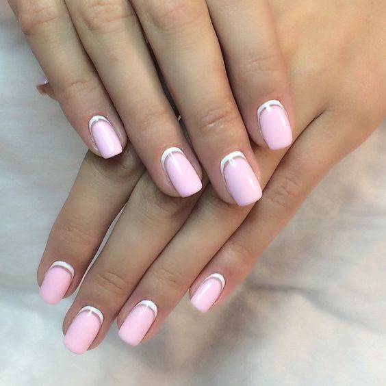 В классическом варианте обратного френча предполагается использование розового цвета в качестве базового. Второй цвет зависит от того, какой характер вы хотите задать маникюру. Выбирать белый цвет стоит, если вы предпочитаете легкость, но в то же время сдержанность. В свою очередь, черный сделает дизайн чуть более строгим за счет контрастности.