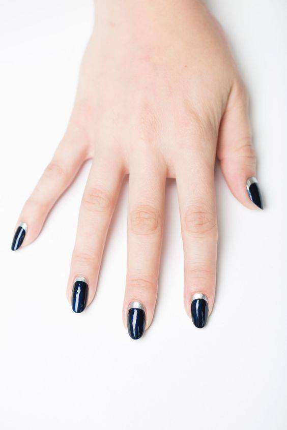 Тем, кто хочет немного разбавить классику, рекомендуем выбирать лаки с металлическим эффектом. К примеру, сочетание красного и золотого или же черного и серебристого смотрится очень красиво. Обратный френч в таком цветовом решении подойдет даже для вечернего выхода или тематического мероприятия. При желании его можно дополнительно украсить стразами или скотч-лентой.