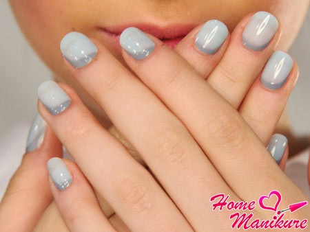 Красивый френч наоборот можно сделать с эффектом градиента. Качественный дизайн обеспечит использование аэрографа, чтобы переход цвета был равномерным. Начинать градиент нужно не от кончика ногтя, а от основания.