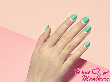 Эта техника по виду практически не отличается от «линии улыбки», но процесс создания такого дизайна несколько разниться. Для начала наносится основной слой (к примеру, белый лак – он и будет в итоге цветом обратной улыбки). После просыхания этого слоя, наносится следующий, другого цвета. Только вот покрытие ноготка происходит не полностью, а частично, с выделением «улыбки».