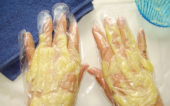 Должны получиться своеобразные парафиновые «перчатки». Кисти обмотать пищевой пленкой, а сверху надеть теплые рукавички. Держать полчаса. Парафин снять, кожу смазать увлажняющим кремом.