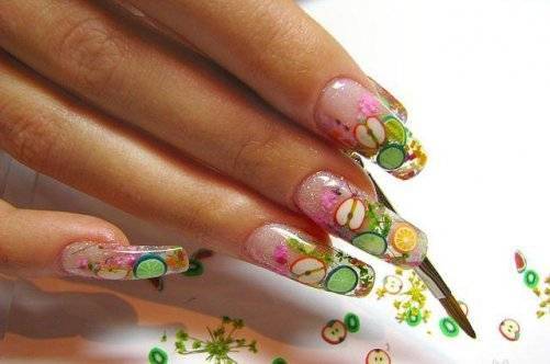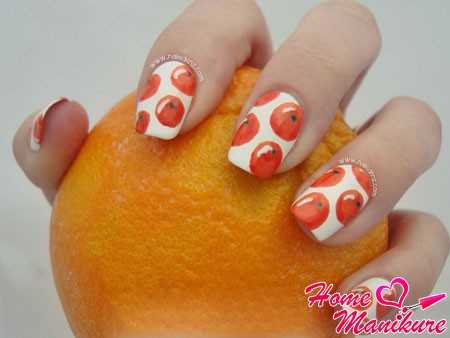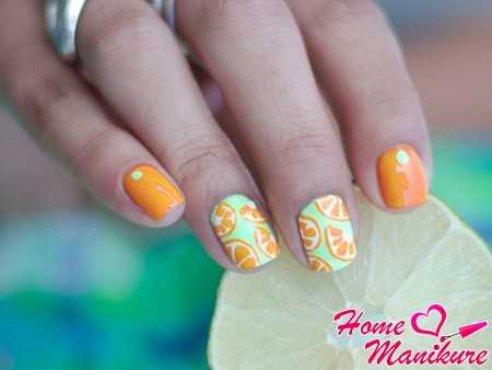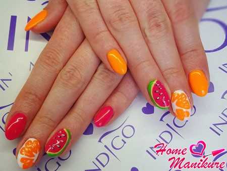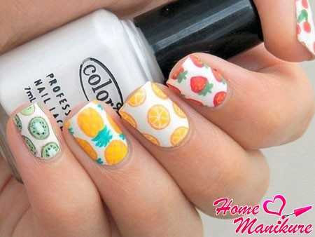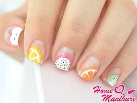 светло-розовый цвет маникюра с рисунком цитрусов и других разных фруктов; и множество других идей, которые вы можете увидеть на фото.