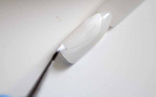 Обмакиваем кисть-волос в белый гель-лак и прямо по мокрому топу рисуем легкие тоненькие прожилки, направленные к центру. Сушим под лампой.
