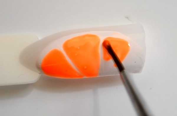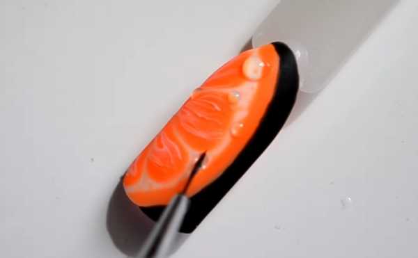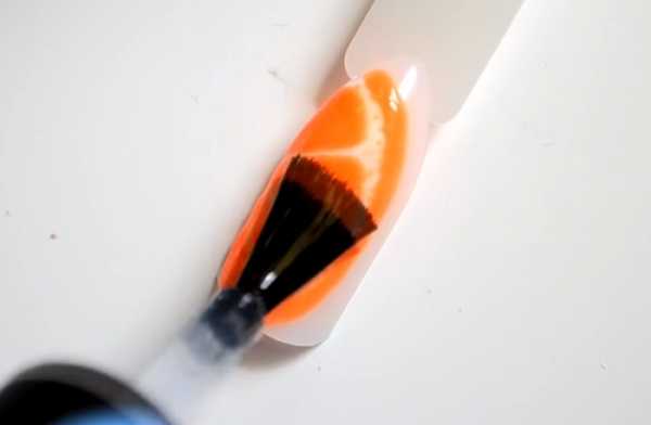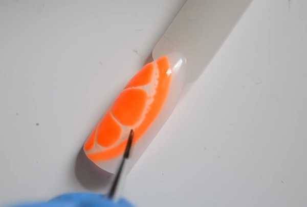 - Далее можно формировать мякоть фрукта. Для этого необходимо закрасить дольки гель-лаком оранжевого цвета. Чтобы оттенок был более ярким, следует нанести 2 слоя (обязательно каждый нужно просушить). Апельсиновую кожуру требуется выделить этим же лаком, а затем по белой линии расставить маленькие точки. Теперь полноценный рисунок можно просушить.