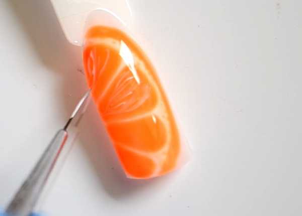 Теперь в белый гель-лак на палитре (листике фольги) добавляем буквально полкапли оранжевого и получившимся нежным, едва заметным цветом выделяем линию кожуры и границы между дольками. Сушим под лампой.