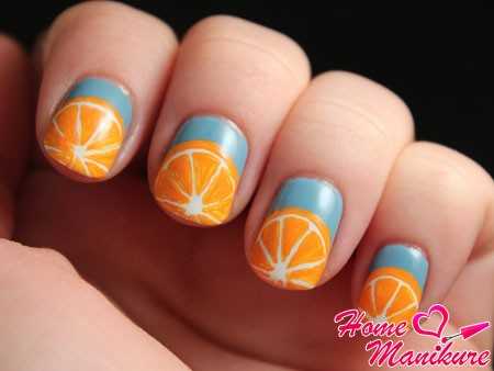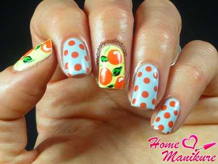 - голубая основа ногтей, на которой везде нарисованы небольшие апельсины с зелеными листьями;