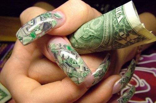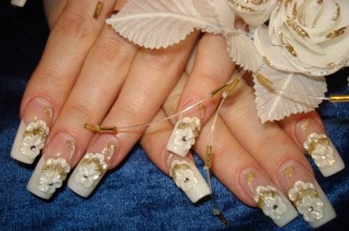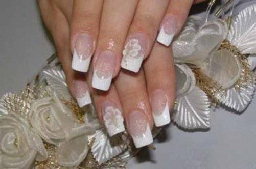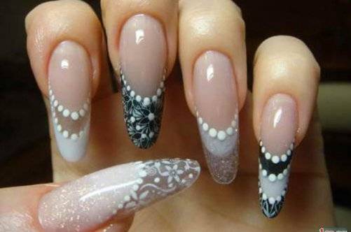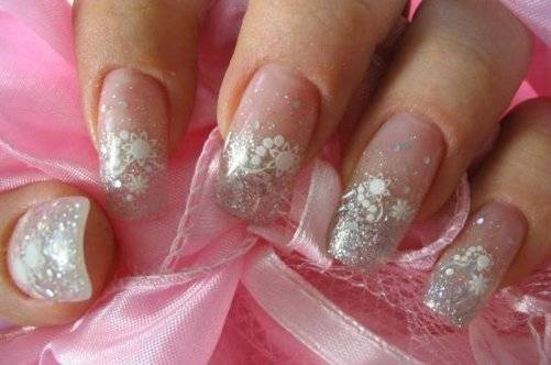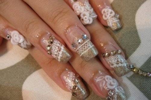 - белый маникюр со стразами и дольки фрукта на каком-то пальце с добавлением украшений;