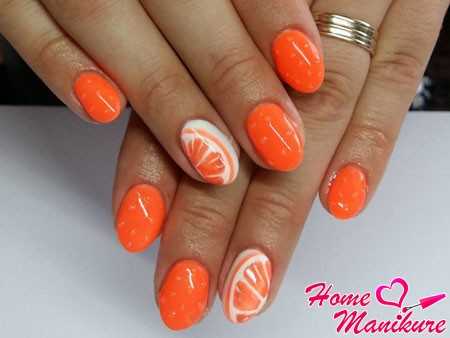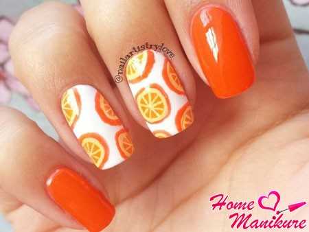 Чаще всего дизайн ногтей с апельсином выполняется в оранжевом цвете с таким же оттенком на других пальцах. Но есть и другие варианты, которые смотрятся не менее оригинально: