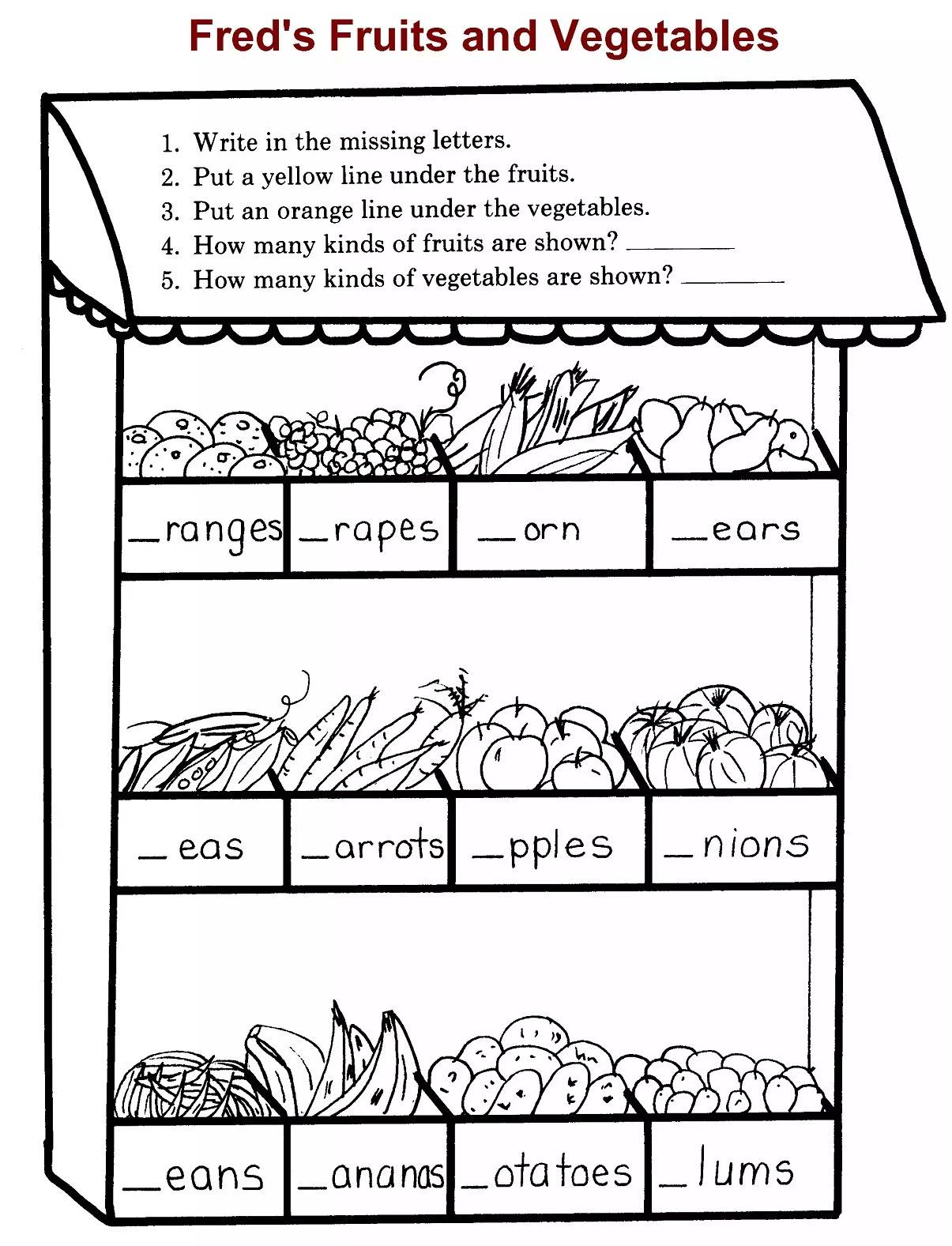 - Внимательно рассмотрите прилавок с продуктами и дополните слова, написанные на прилавках, пропущенными буквами.