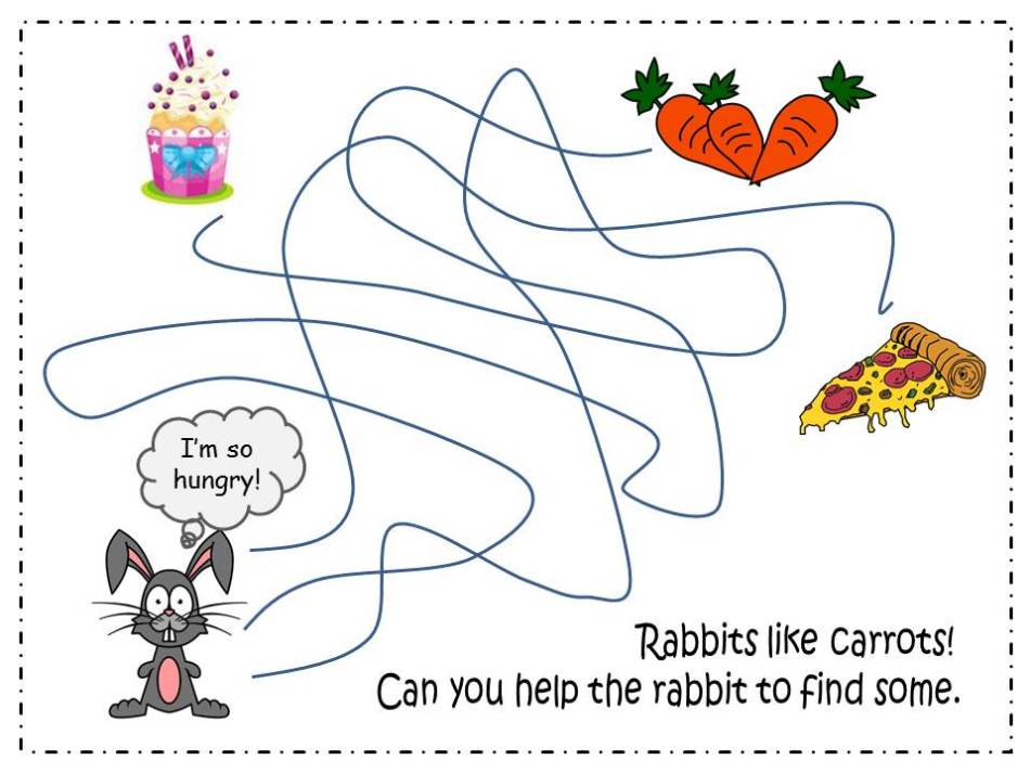 - Простое задание для малышей, просто проведите дорожку от зайчика до его любимого продукта питания, а потом назовите его.