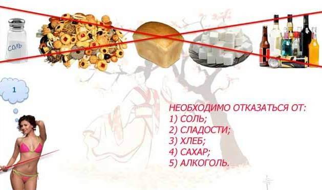 Соблюдая такой рацион, важно исключить из меню сладости, хлеб и сдобу, исключение составляют сухари из муки грубого помола. Запрет на соль. Похудеть японская диета, независимо от количества ограничительных дней, помогает за счет выведения лишней жидкости, чему способствует безсолевый рацион