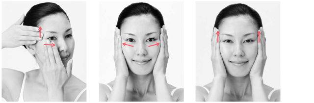 - Не двигая большими пальцами, остальные отведите к височной зоне, глубоко продавливая ткани. Указательные пальцы при этом должны повторить очертания нижнего века.