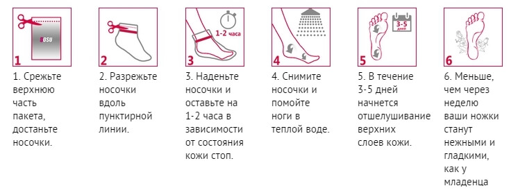 Перед проведением процедуры следует вымыть, а лучше распарить стопы для получения лучшего эффекта. Первый результат от применения изделий виден через 3-6 дней, кожа начнет постепенно отслаиваться, это похоже на шелушение после сильного загара. Ускорить эффект помогут ежедневные горячие ванны и обработка стоп пемзой, пилкой или специальной щеточкой.