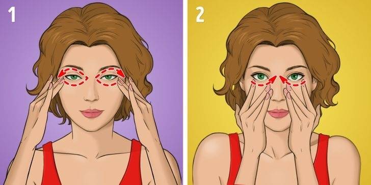 Дотроньтесь подушечками средних пальцев на фронтальную зону глаз и слегка надавите, а после проведите вокруг век. Через секунду поднимитесь к бровям, а потом опять к глазам.