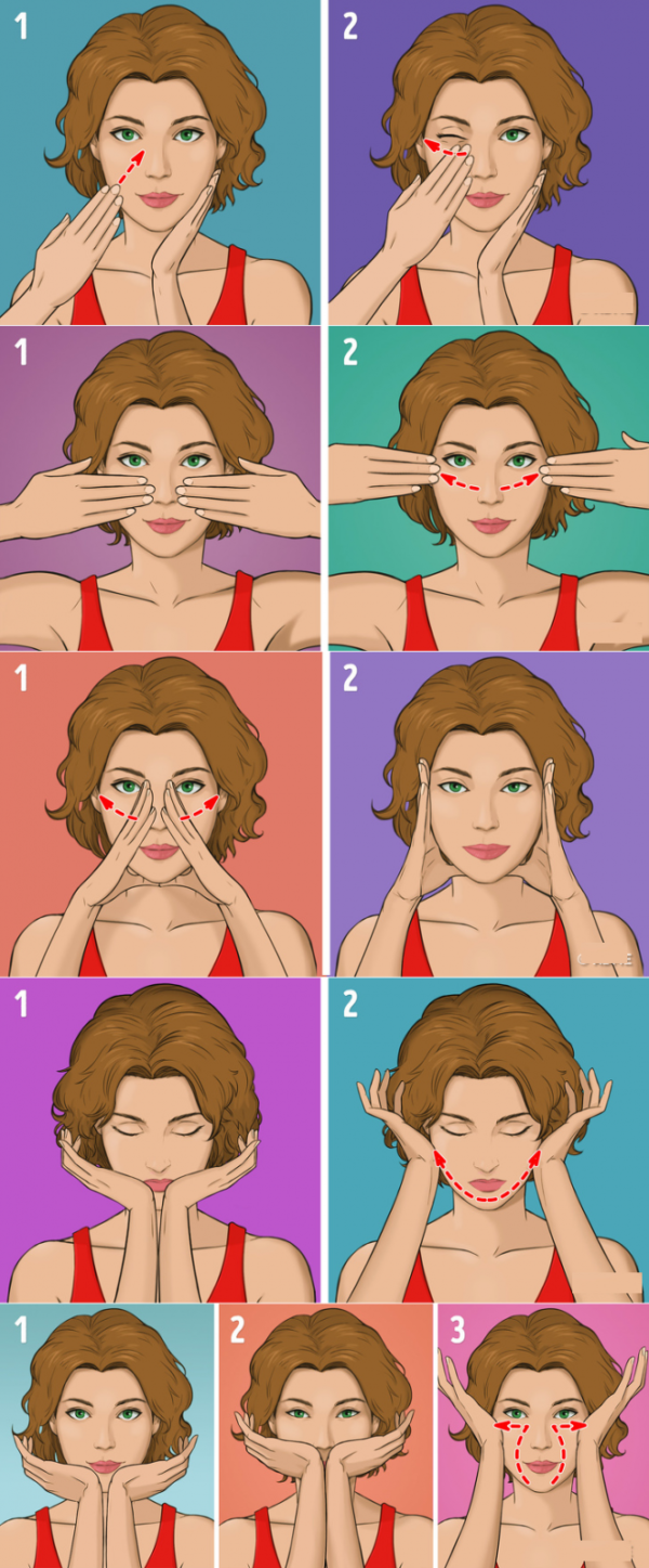 Ладонями прогладьте все лицо по обеим сторонам, начиная с середины лба, заканчивая ключицами.