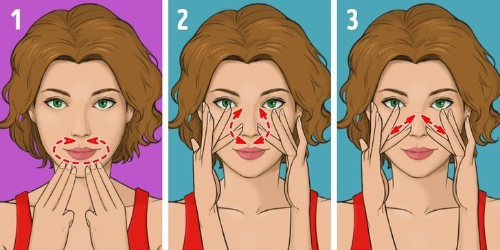 Это движение необходимо повторить 4 раза, а затем перейти к основным. Положите руки на подбородок и проведите полукруглым движением возле губы. Далее, продолжайте такие движения и поднимайтесь к ноздрям, а потом опять к губам. Теперь от носика переходим к щечкам и делаем так несколько раз.