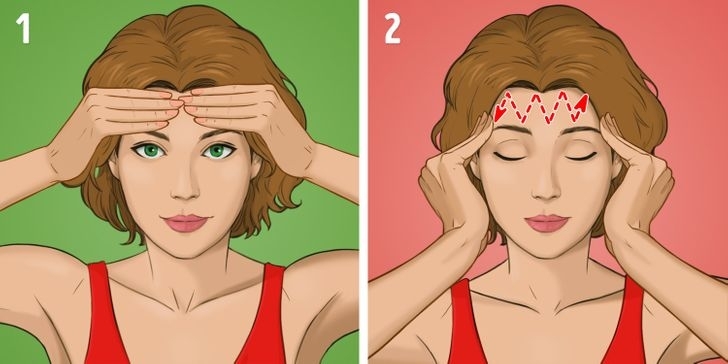 Прижмите пальцами центр лба, а после проведите зигзагообразными движениями к височной зоне.