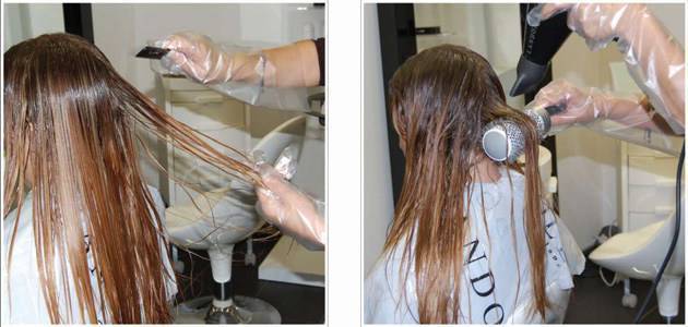 - Затем наносится один из разглаживающих составов: слабой, средней или повышенной крепости, в зависимости от состояния волос и того, какого результата нужно добиться.