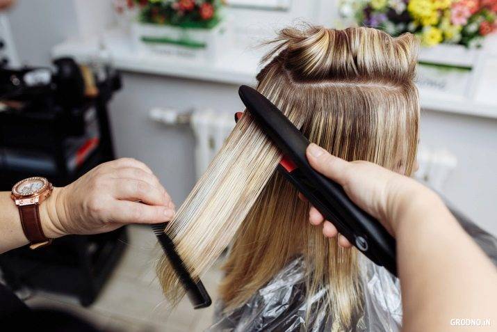 - Теперь самый важный этап — выпрямление. Для этого используется профессиональный утюжок, более того, мастер тщательно вытягивает прядь за прядью, в результате чешуйки волос закрываются и лечащий состав «запечатывается» в них.
