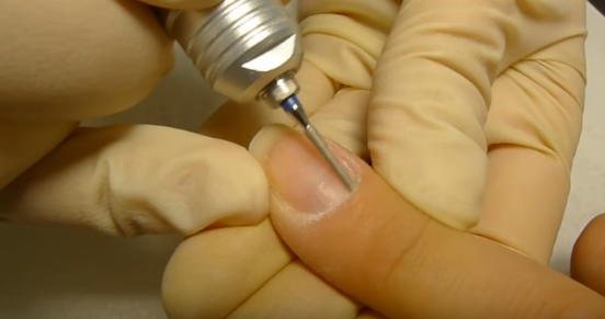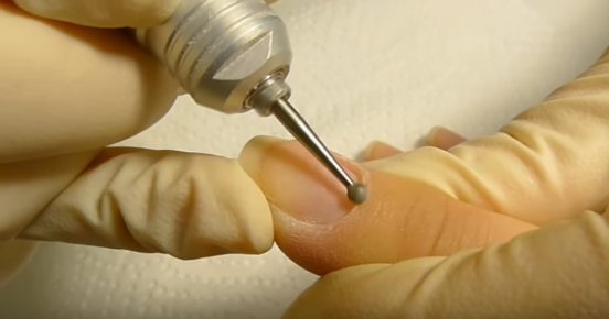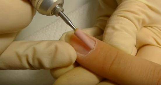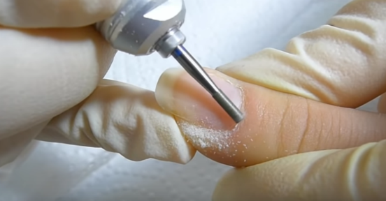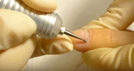 В отличие от первого шага, где использовался цилиндр с острым навершием, здесь будет применяться фреза — пуля. Это шаг можно пропустить. Лучше всего ее применять, если у вас глубокие боковые валики. Действуем ей лишь в боковых пазухах, не заходя на кутикулярную зону ногтя, иначе фрезой такого типа можно оставить след.