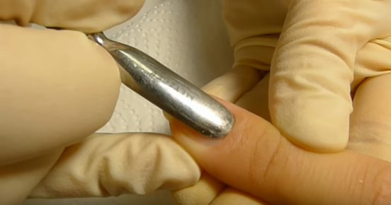 Этим инструментом подталкиваем кутикулу. Создаем ее круглой формы и смотрим насколько чисто получилось. Затем покрываем ногтевые пластины как можно ближе к кутикуле.