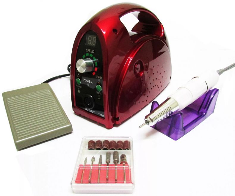 Ассортимент насадок постоянно расширяется. Фрезы бывают керамические, твердосплавные, алмазные. Сам прибор для ногтевого сервиса состоит из корпуса с блоком питания и рабочей ручки с патроном, фиксирующим наконечники. Профессиональный маникюрный аппарат оснащается ножной педалью переключения скоростного режима вращения насадок, встроенным пылесосом и пылесборником.