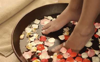 На стопах не должно быть каких-либо ран, потертостей или порезов. Сначала нужно размягчить кожу стоп, поместив ноги в таз с водой на 4-5 мин.