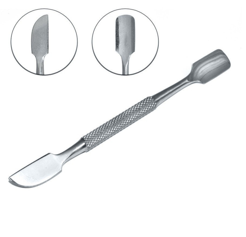 - Пушер — также служит для того, чтобы сдвигать отросшую кожу. Данный прибор представляет собой палочку с заостренной пластиной на конце. Чаще всего бывает металлическим. Иногда встречаются пластмассовые и деревянные варианты.