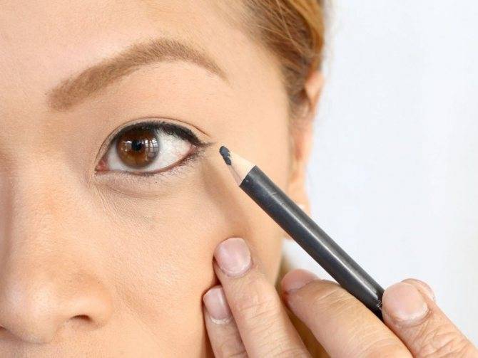 Карандашом на внешнем уголке глаза рисуется стрелка в форме галочки.
