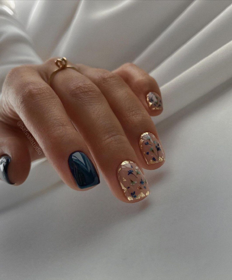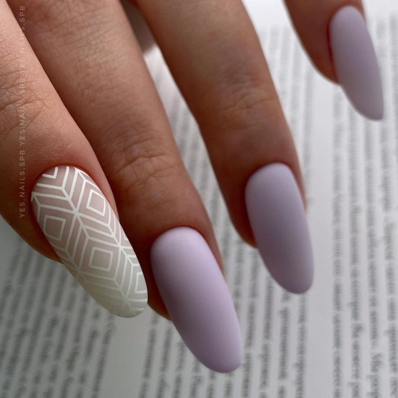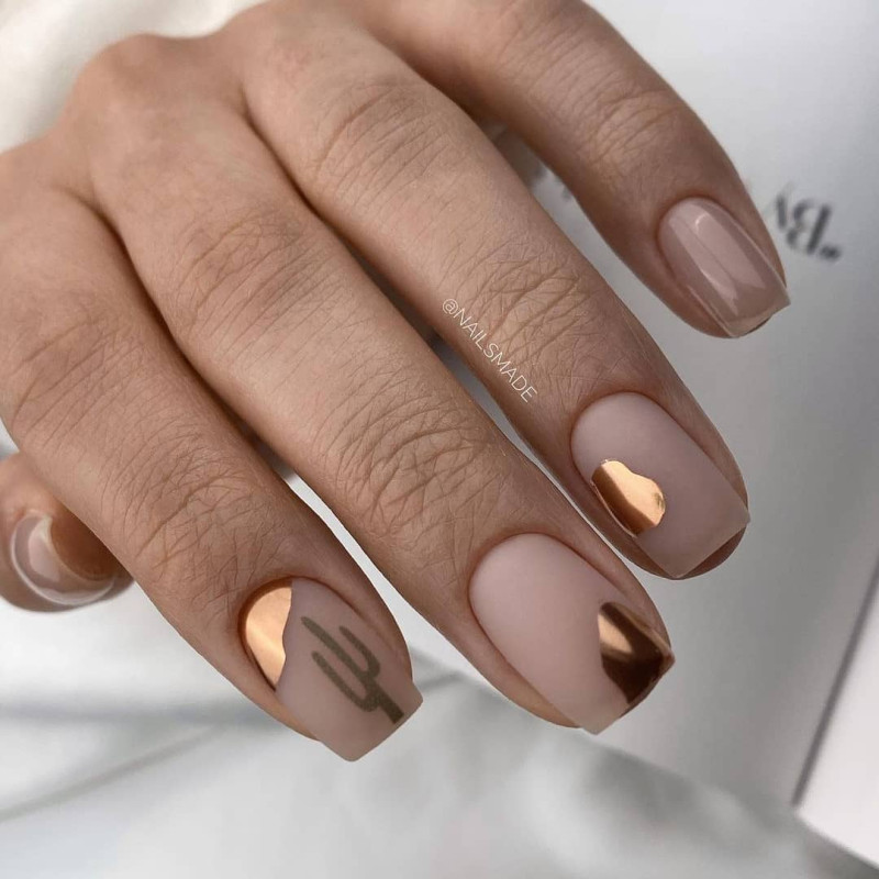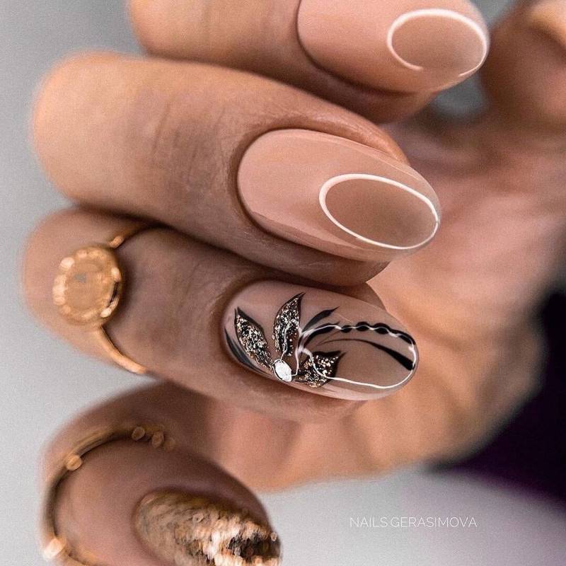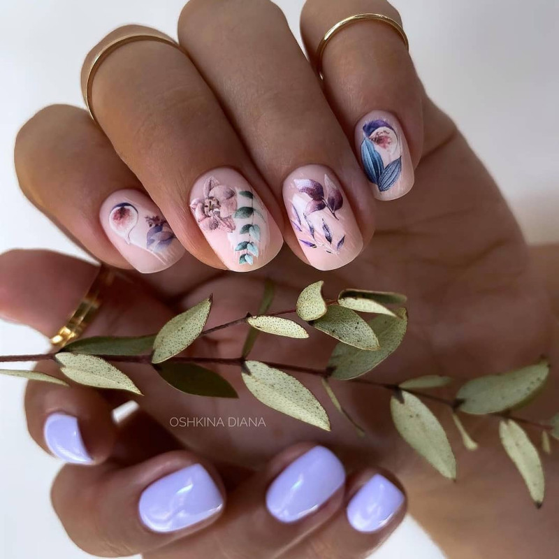 Одним из самых главных трендов является сочетание натуральности и яркости. Оно отлично проявляется на ногтях небольшой длины, которые имеют в основе нюдовые или базовые оттенки и декорированы яркими принтами, стемпингом, рисунками. Это могут быть небольшие цветочки на натуральной основе, хаотичные или геометрические линии, яркие пятна или кляксы и другие варианты.