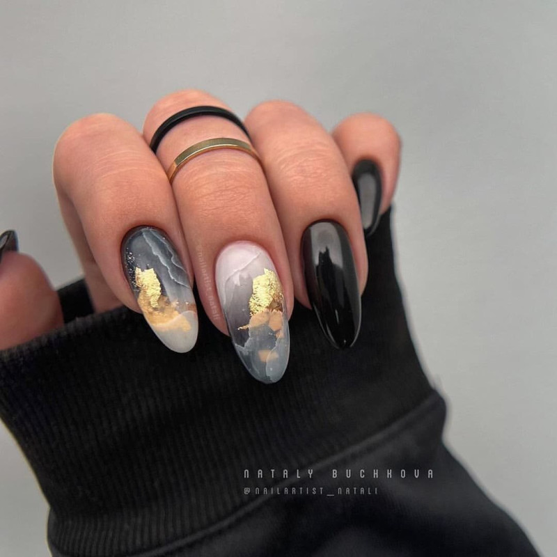 - Большой популярностью в нейл-дизайне будут пользоваться металлические глиттеры. Популярным выбором для этого образа будет фольга, которая придаст внешнему виду мягкий, красивый металлический эффект.