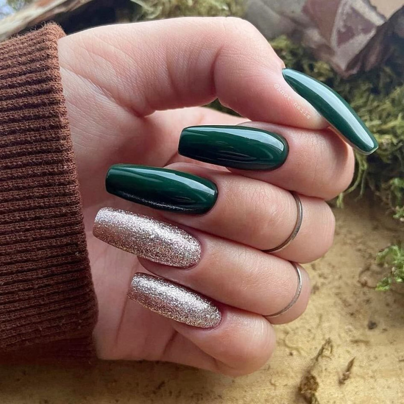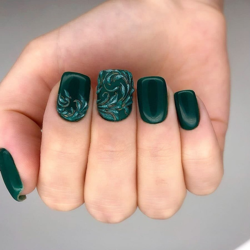 Глубокий зеленый цвет ассоциируется с лесными мотивами в осенний сезон. Оттенок придает маникюру элегантность и таинственность. Можно использовать подобный цвет в качестве фона, на который наносятся яркие желто-оранжевые листья.