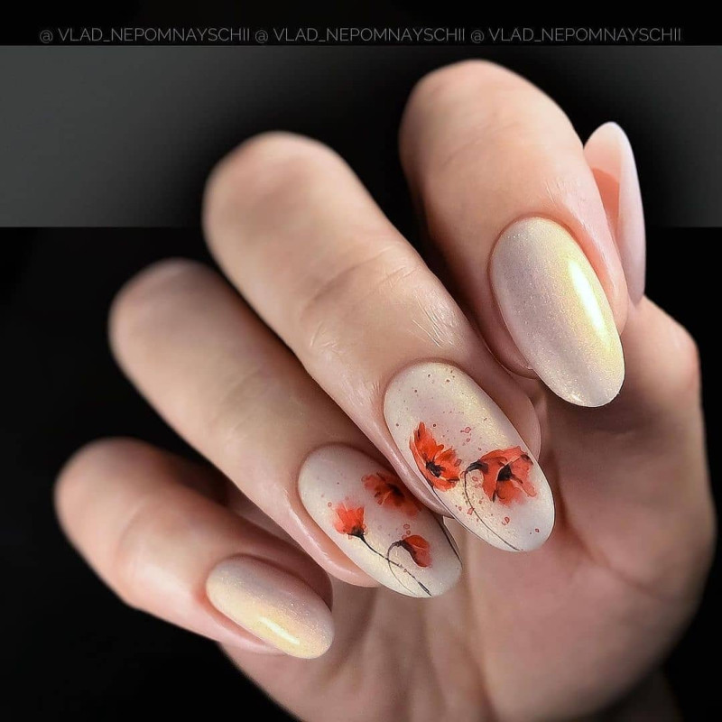 Для цветочного дизайна можно использовать классический красный оттенок. Также он отлично подойдет для популярного фруктово-ягодного дизайна маникюра на лето . Чтобы придать сочности и объема можно расставить акценты в виде капелек.