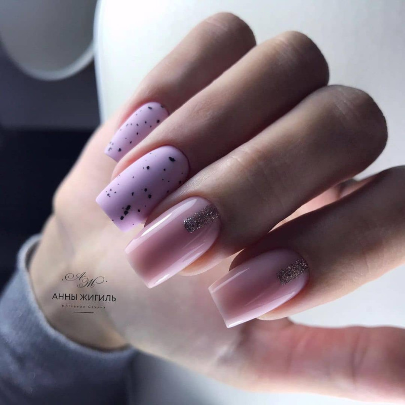- с глянцевыми или глиттерными акцентами на один-два пальчика или выделение с их помощью линии «улыбки», лунки;