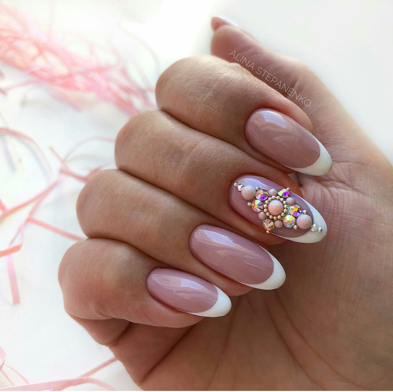 Одной из самых распространенных и любимых модницами является миндалевидная форма. Эта форма универсальна и подходит для любых типов пальцев и длины пластины. Однако, если вы активный человек и у вас длинные ногти, то такая форма не лучший вариант: легче всего ломается и не подходит людям со слабыми или ломкими ноготками.