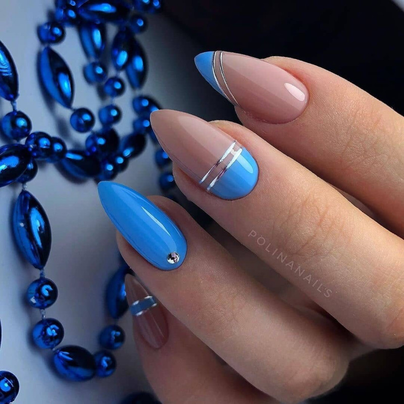 Маникюр 2023 года, выполненный в насыщенном голубом цвете, гармонично вписывается в морскую тематику. Ногти покрывают однотонным блестящим глянцем или наносят на них полоски, чередующиеся в белоснежном и голубом цвете. Поверх можно нанести рисунок в виде якоря, штурвала в золотистом либо серебристом оттенке. Альтернативное решение – прибегнуть к объемному декору в виде ракушки или морской звезды.