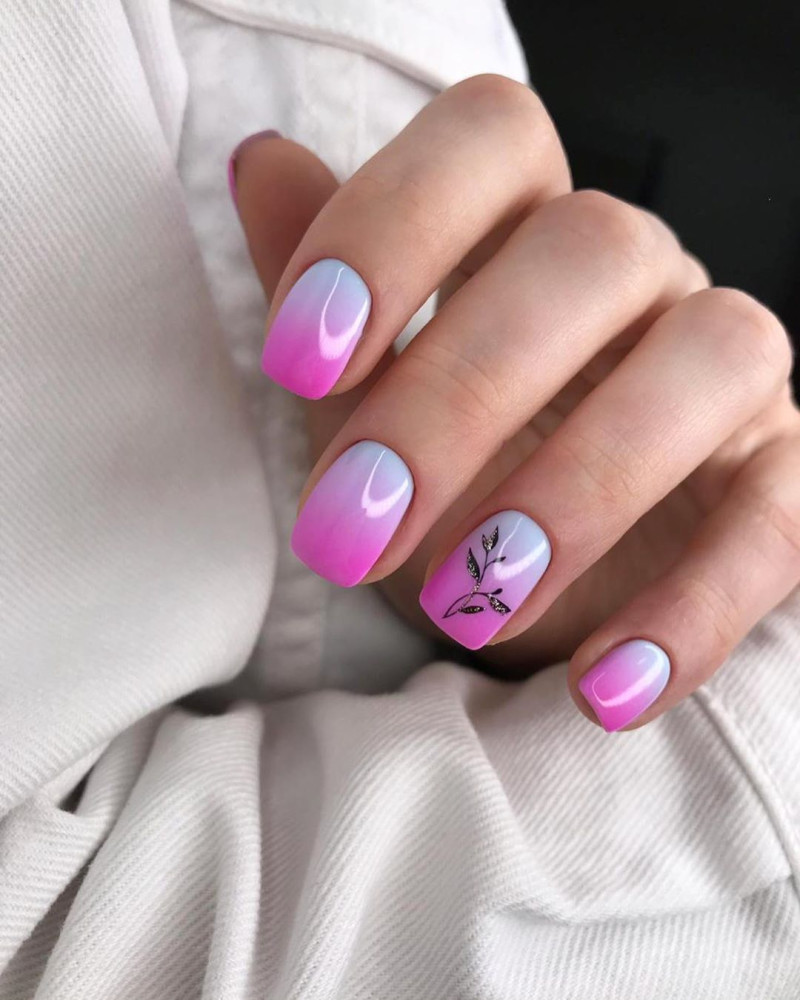 Если говорить о сочетании ярких красок на ногтях, стоит отметить что техника омбре в исполнении гель-лаком будет довольно популярна, поскольку постепенный переход допустим от темно-зеленого к светло-розовому оттенку смотрится довольно красиво и броско, а потому окружающие всегда будут обращать внимание на такой маникюр