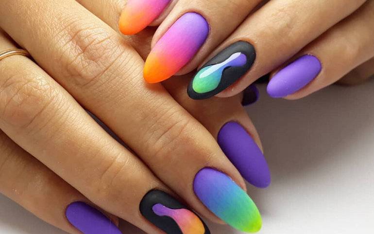 Неоновые разноцветные тона хорошо сочетаются с этническими узорами. Такое исполнение даже чем-то напоминает актуальное омбре, но с более креативным подходом.
