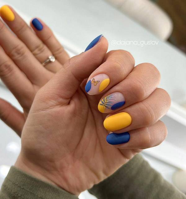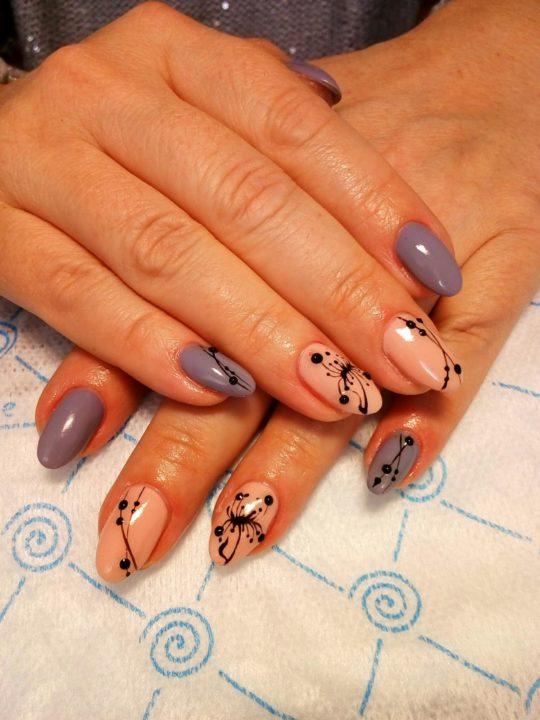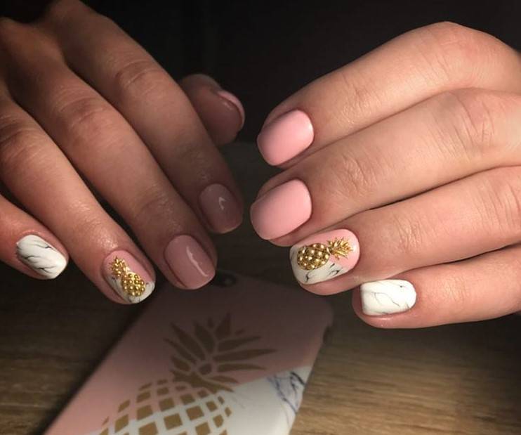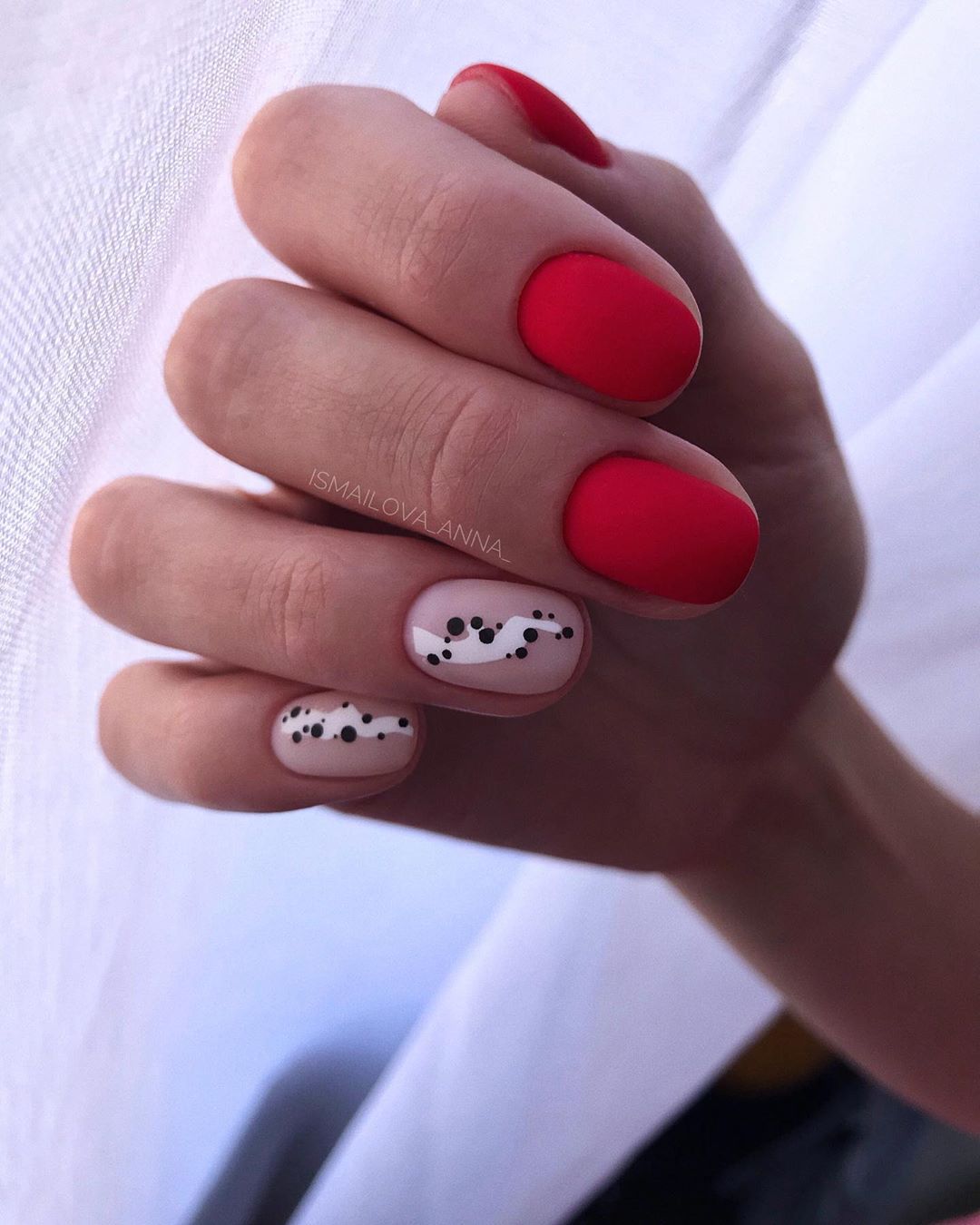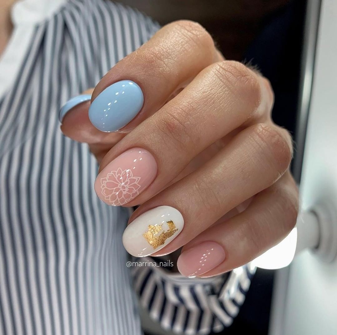 Одним из самых главных трендов является сочетание натуральности и яркости. Оно отлично проявляется на ногтях небольшой длины, которые имеют в основе нюдовые или базовые оттенки и декорированы яркими принтами, стемпингом, рисунками. Это могут быть небольшие цветочки на натуральной основе, хаотичные или геометрические линии, яркие пятна или кляксы и другие варианты.