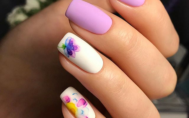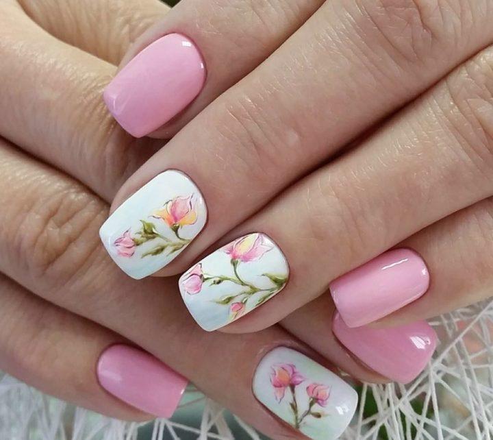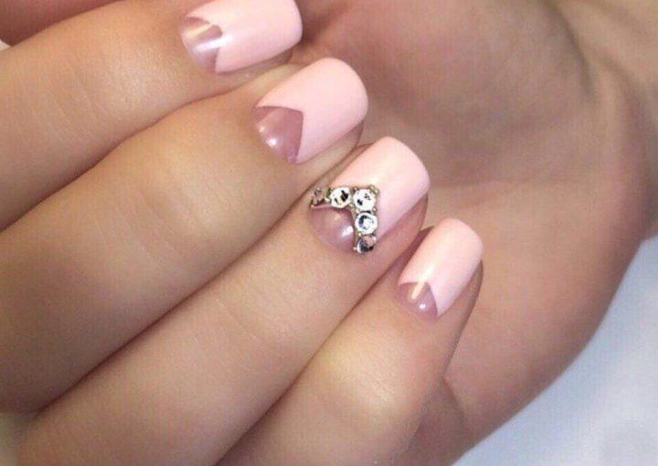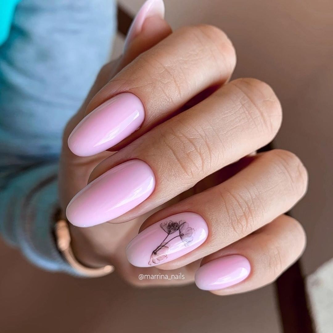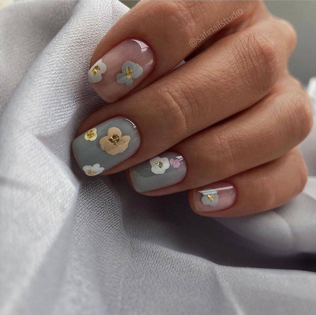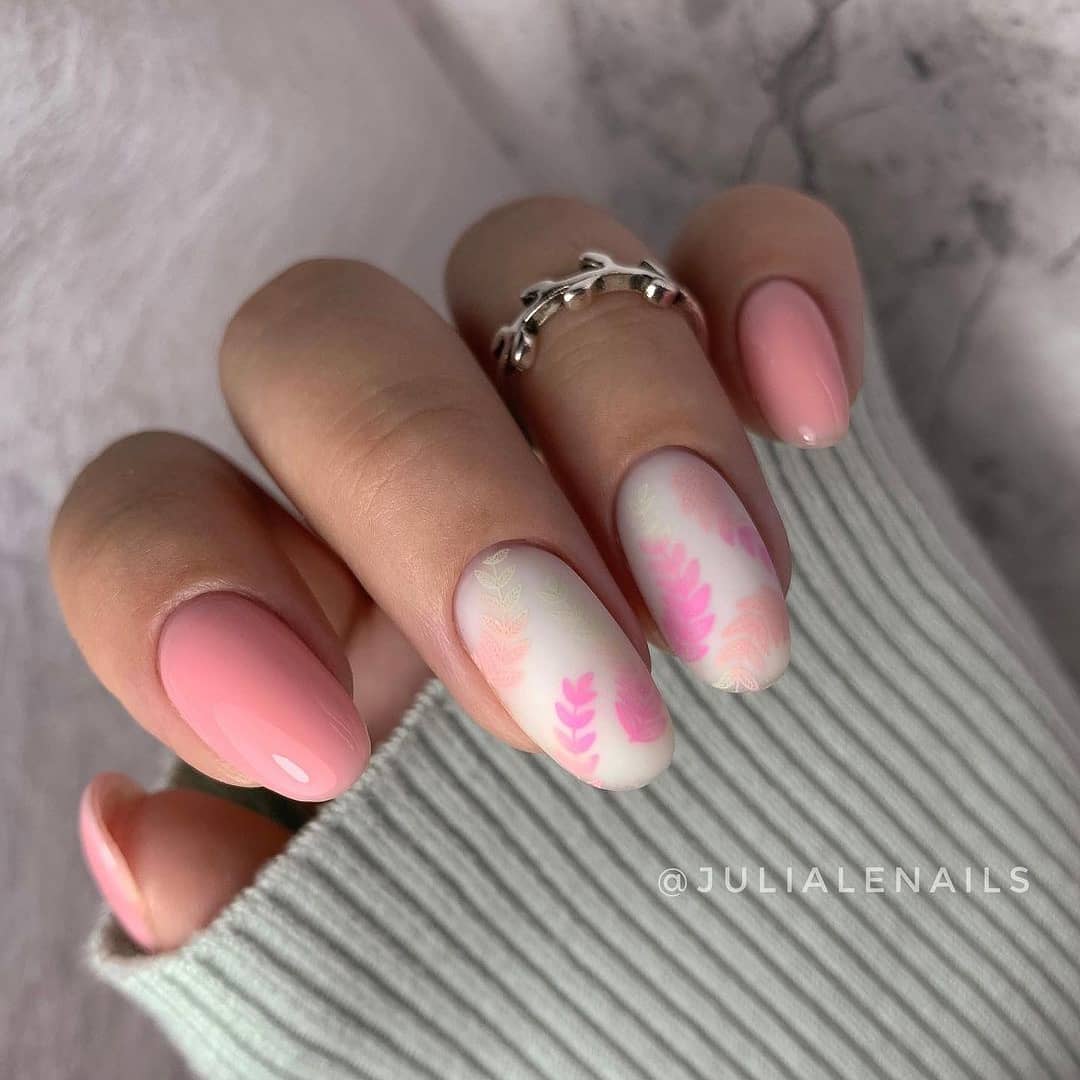 Одним из самых главных трендов является сочетание натуральности и яркости. Оно отлично проявляется на ногтях небольшой длины, которые имеют в основе нюдовые или базовые оттенки и декорированы яркими принтами, стемпингом, рисунками. Это могут быть небольшие цветочки на натуральной основе, хаотичные или геометрические линии, яркие пятна или кляксы и другие варианты.