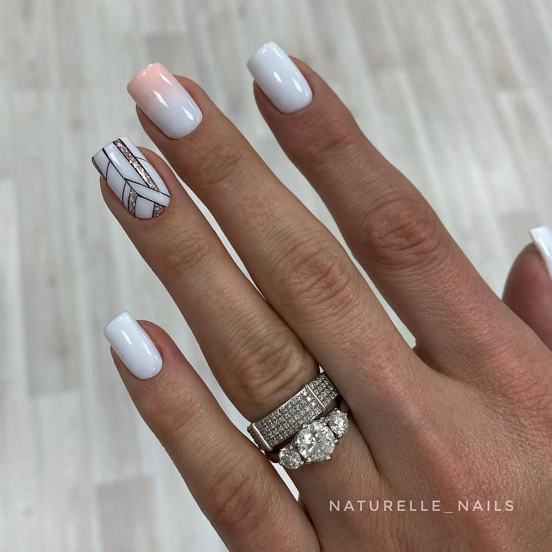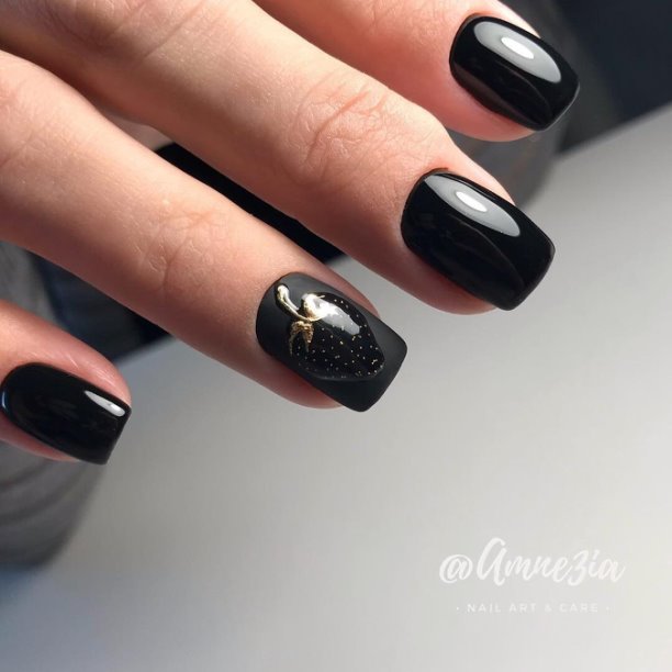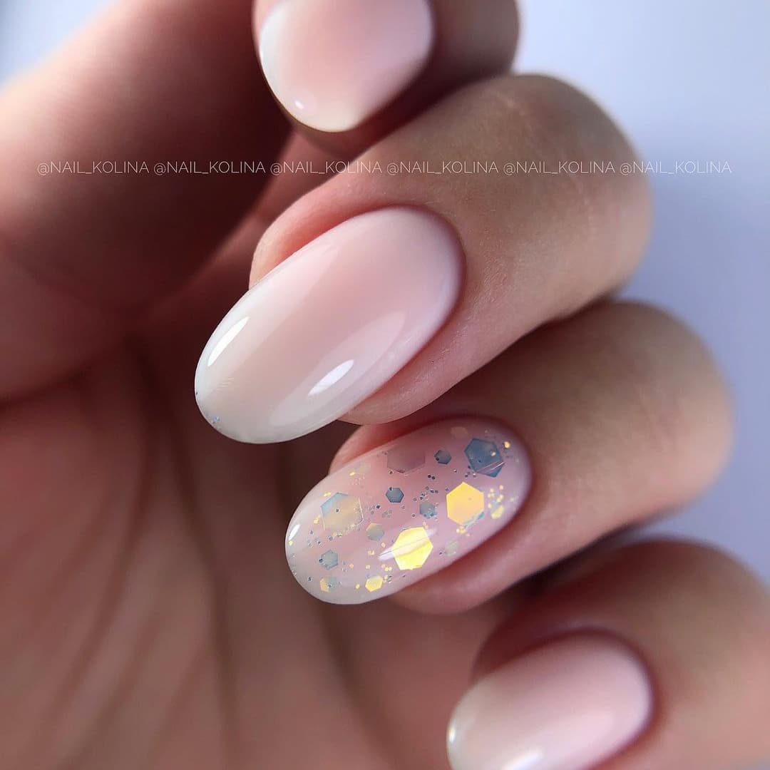 - с глянцевыми или глиттерными акцентами на один-два пальчика или выделение с их помощью линии «улыбки», лунки;