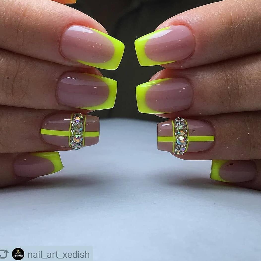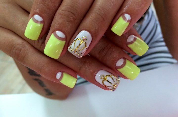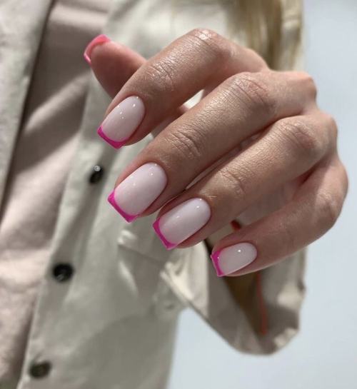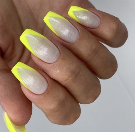 Первое место в нашем модном nail-параде занимает френч — в летнем его исполнении. Это различные варианты оформления кончиков ноготков в модных цветовых решениях: розовых, желтых, салатовых, оранжевых, малиновых, сиреневых и неоновых. Кроме того, основание ноготка может быть как полностью прозрачным, так и выполнено в различных пастельных оттенках: бежевом, молочном, пастельно-розовом, пастельно-голубом.
